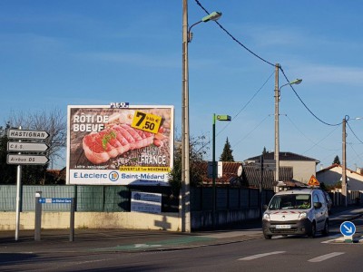 Dans le cadre de sa communication extérieure le centre Leclerc de St Médard en jalles confie l affichage a notre filiale Affi 33 a travers un parc d environ 40 faces affichées chaque semaine ainsi que des panneaux directionnels type longue conservation